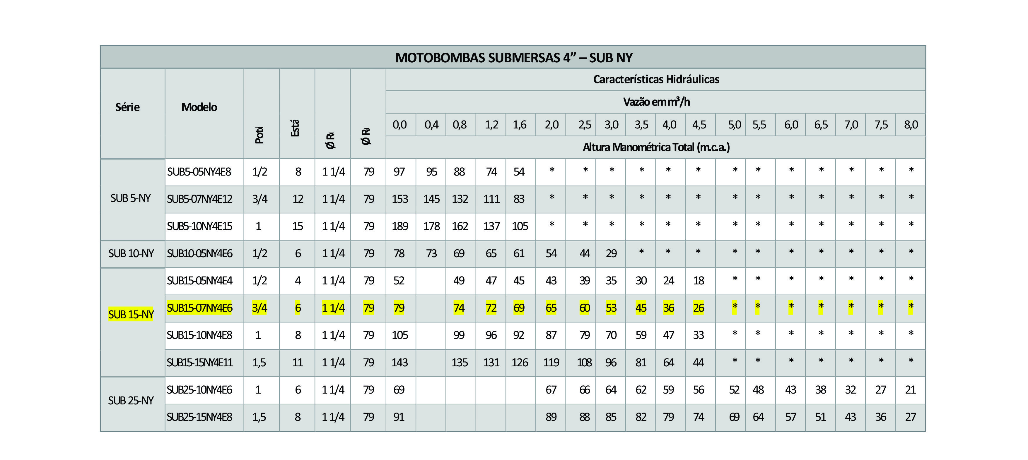 A Linha SUB NY - Rotor fechado é composta por motobombas centrífugas multiestágios, acopladas a motores elétricos projetados especialmente para funcionar dentro da água, a grandes profundidades.