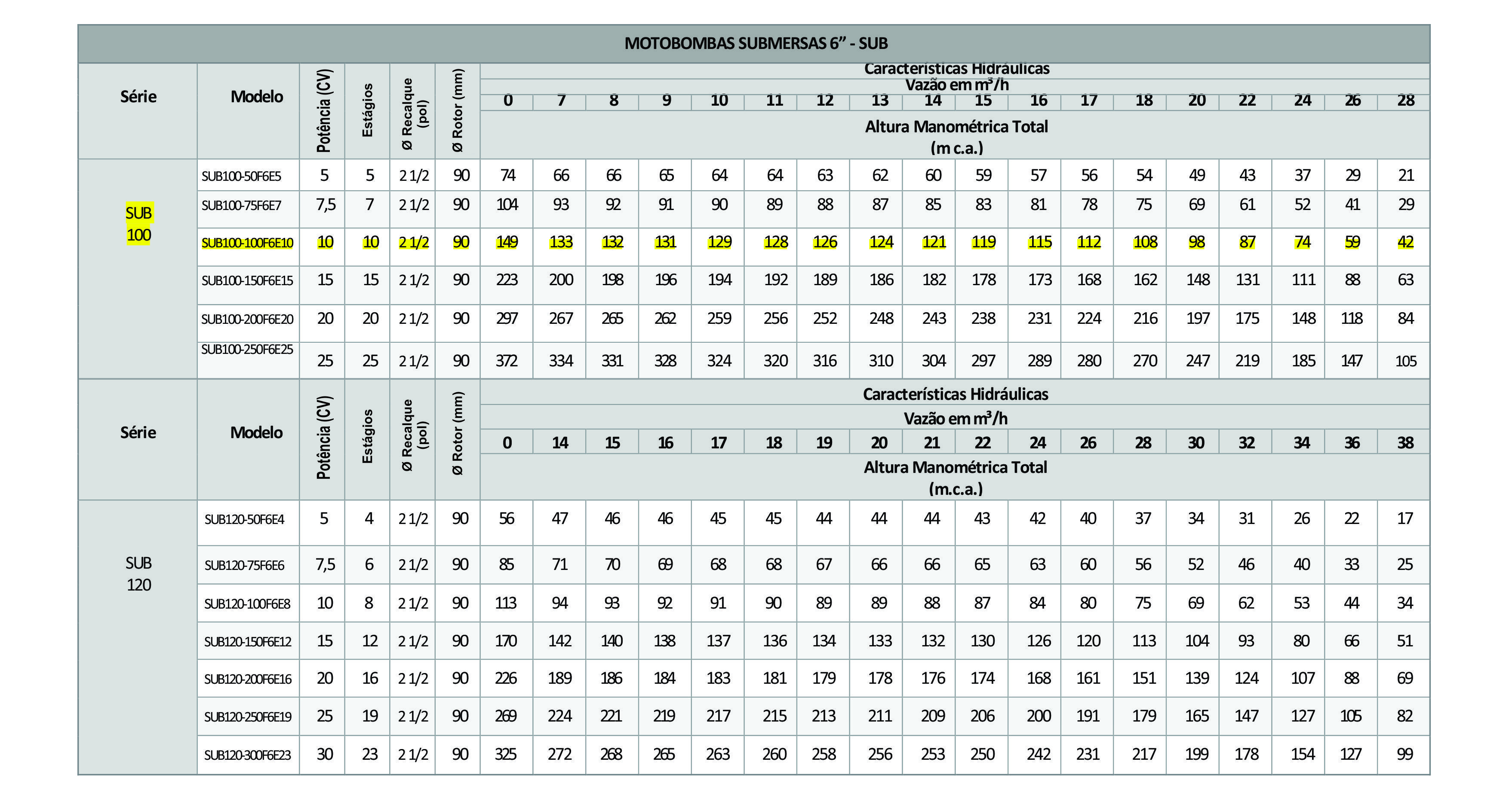 A Linha SUB 100 - Rotor fechado é composta por motobombas centrífugas multiestágios, acopladas a motores elétricos projetados especialmente para funcionar dentro da água, a grandes profundidades.