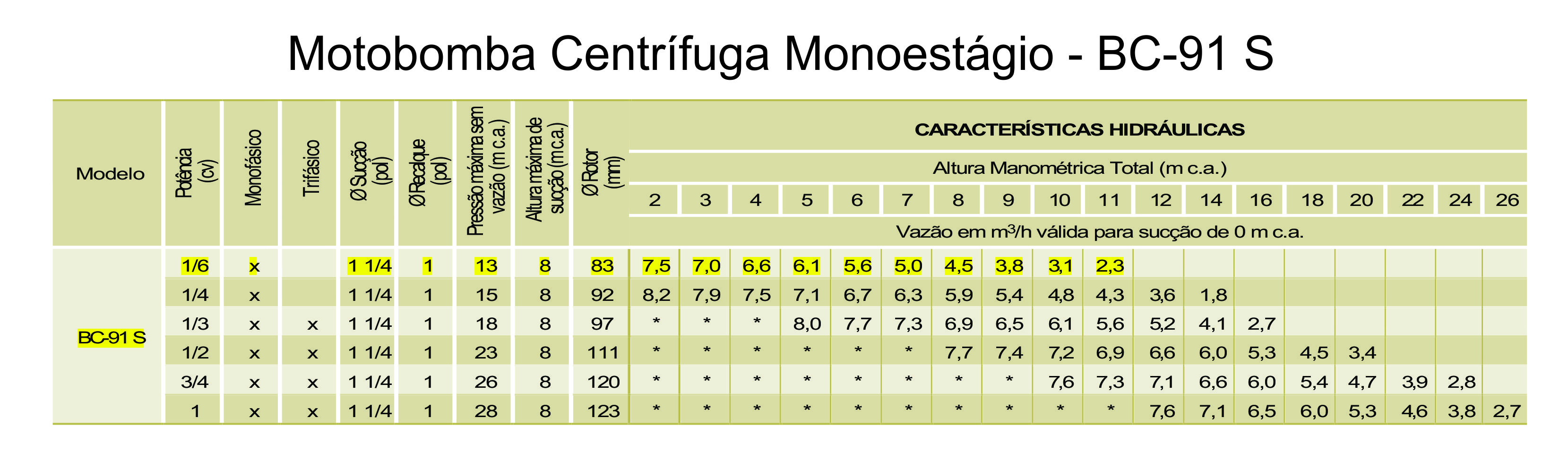 A Linha BC- 91 S - Rotor fechado é composta por motobombas centrífugas de superfície monoestágio, acopladas a motores elétricos.