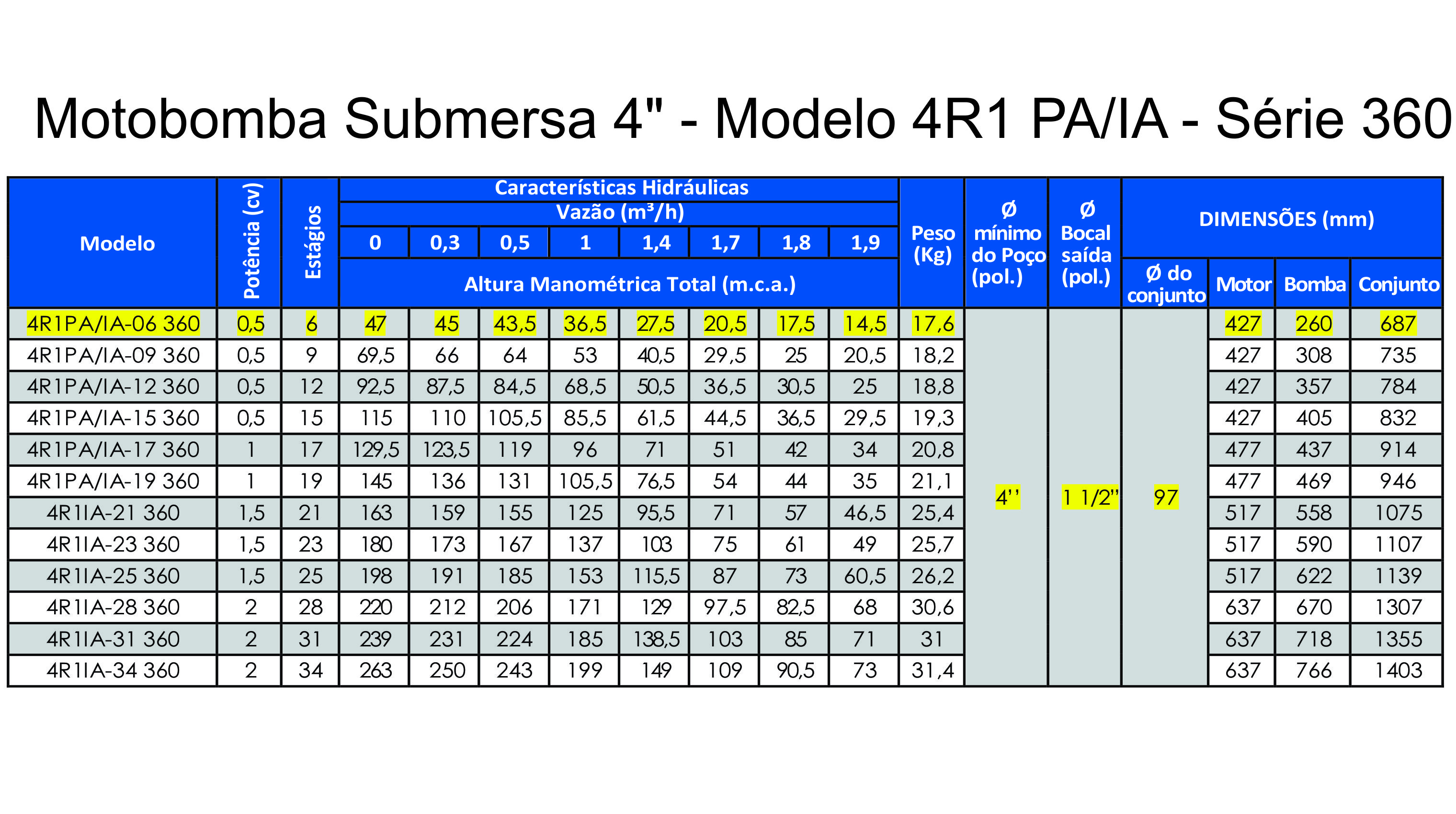 A Linha 4R1 PA/IA - Série 360 é composta por motobombas submersas multiestágios acopladas a motores elétricos com