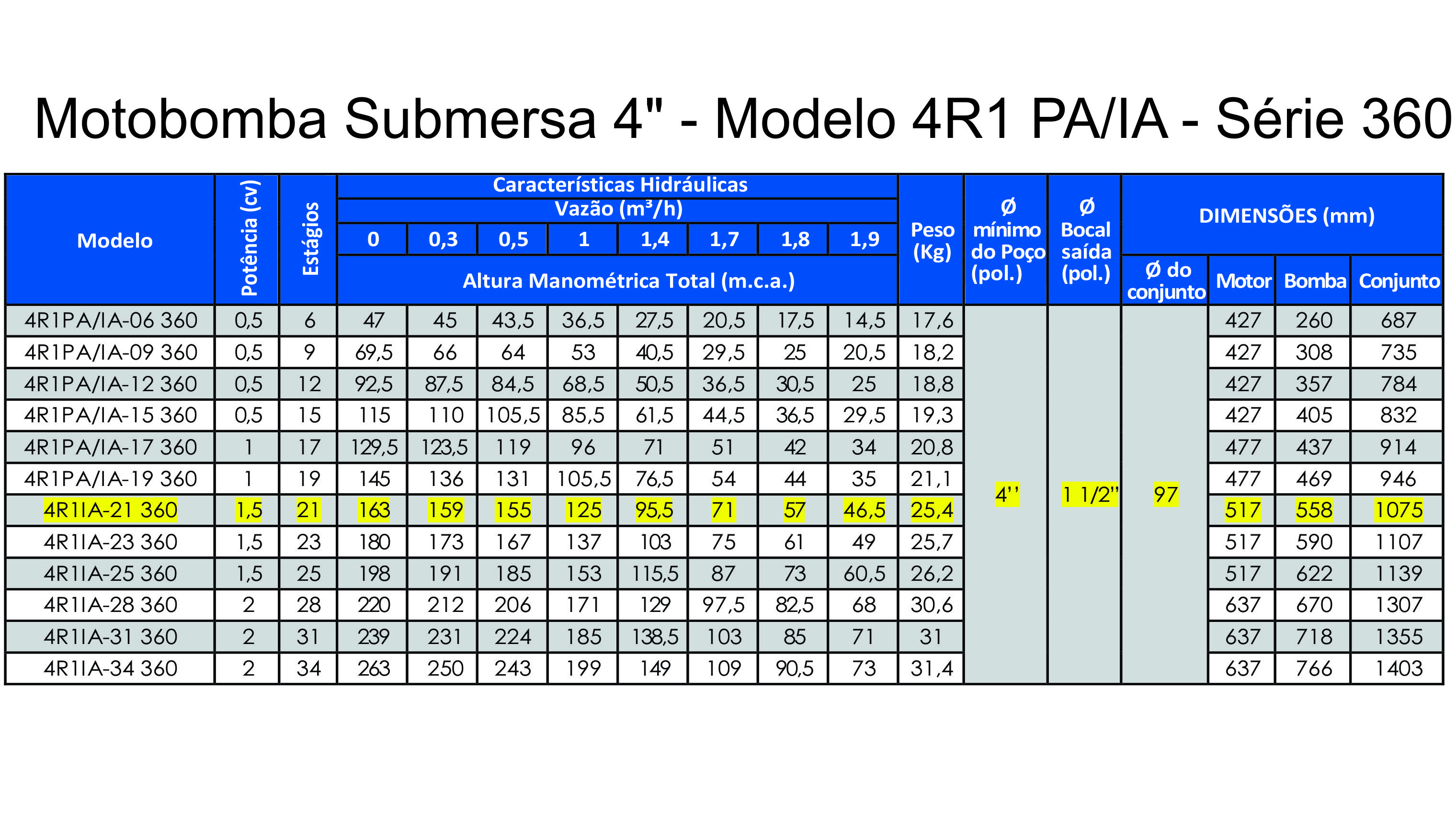 A Linha 4R1 PA/IA - Série 360 é composta por motobombas submersas multiestágios acopladas a motores elétricos com