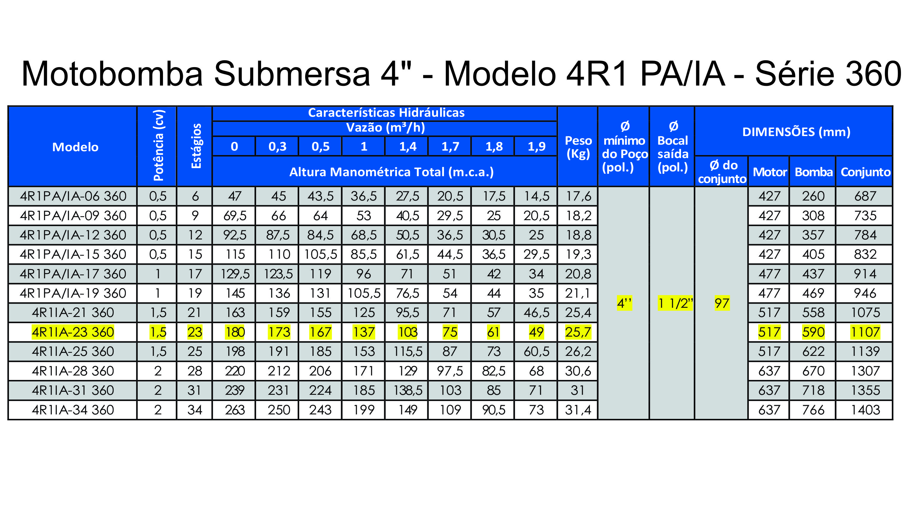 A Linha 4R1 PA/IA - Série 360 é composta por motobombas submersas multiestágios acopladas a motores elétricos com
