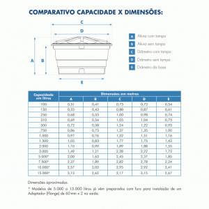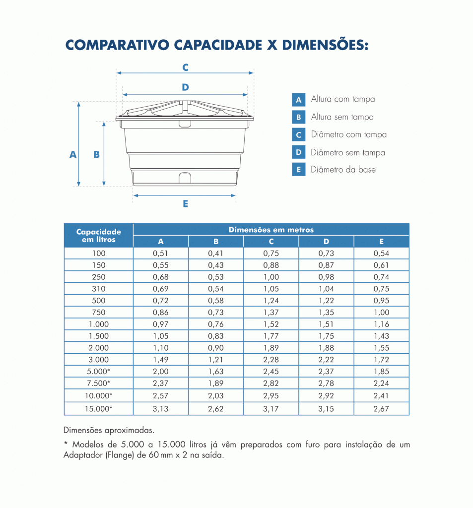 Observações: As dimensões que constam nas informações técnicas são aproximadas. Somente os modelos de 5.000 a 15.000 litros já vêm preparados com furo para instalação de um Adaptador (Flange) de 60 mm x 2" na saída.